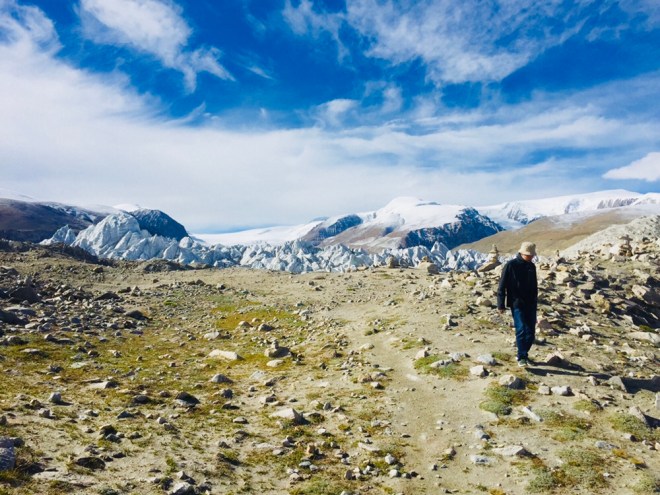 走出冰川時,我們元氣耗盡,十步一停,坐下就不願再起來。停頓的當口,他刷刷幾步衝上一個冰山混雜泥石的小尖坡,在上面久久地抽了一根菸。