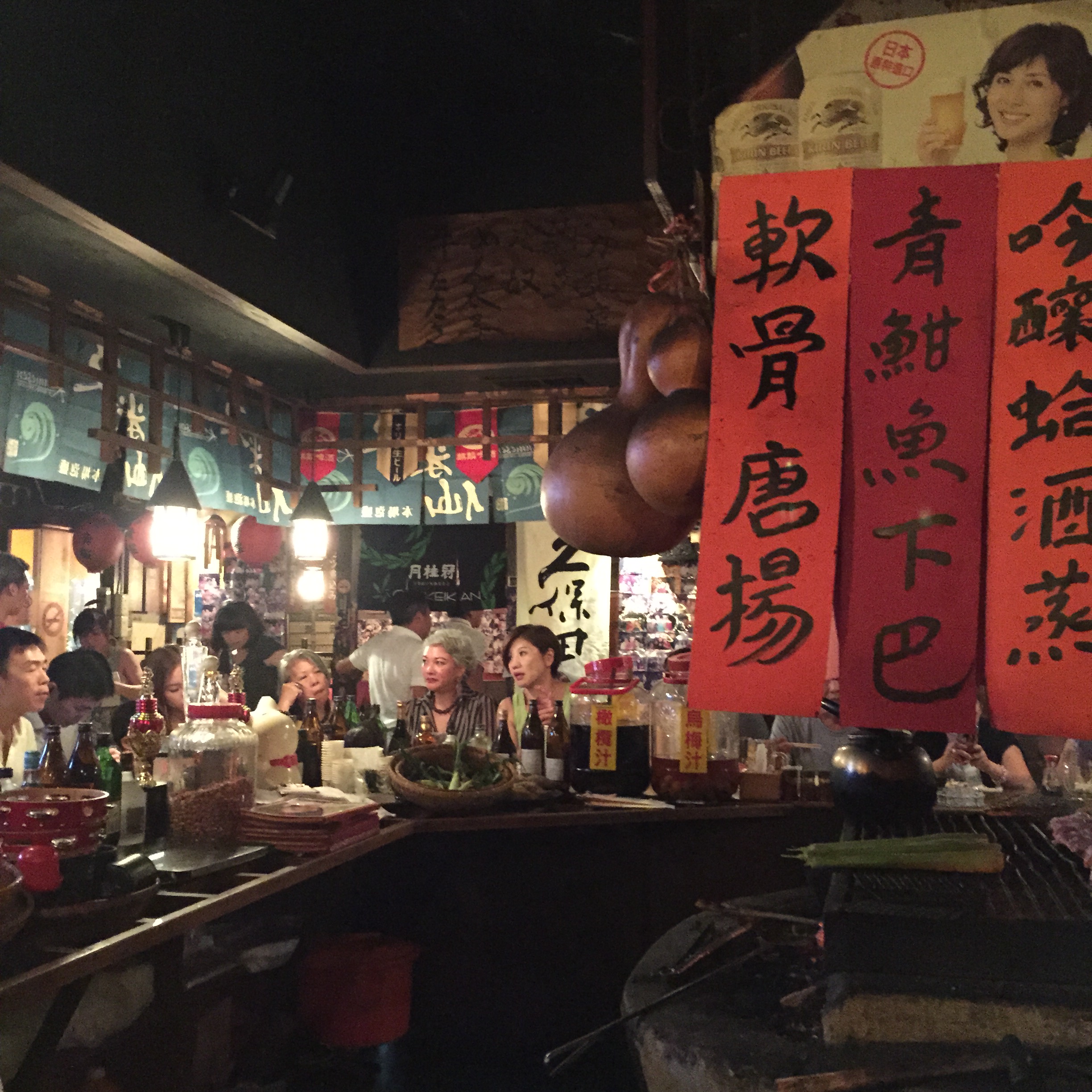 縮在戶外吧檯一角,我心裡踏實了,點了梅酒加烤串,豎起耳朵聽旁邊三位客人的對話。